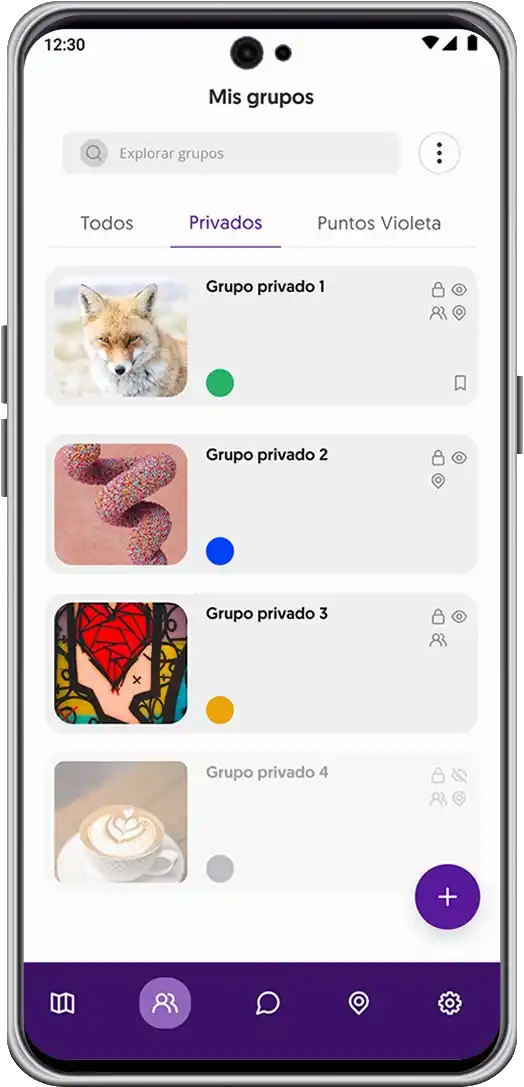 En tus grupos privados, podrás compartir información confidencial con tus amig@s y podréis teneros localizad@s con facilidad, además podréis marcar y compartir, con total privacidad, vuestros propios puntos de reunión para facilitar vuestros encuentros. Todo ello codificado por colores en un plano común